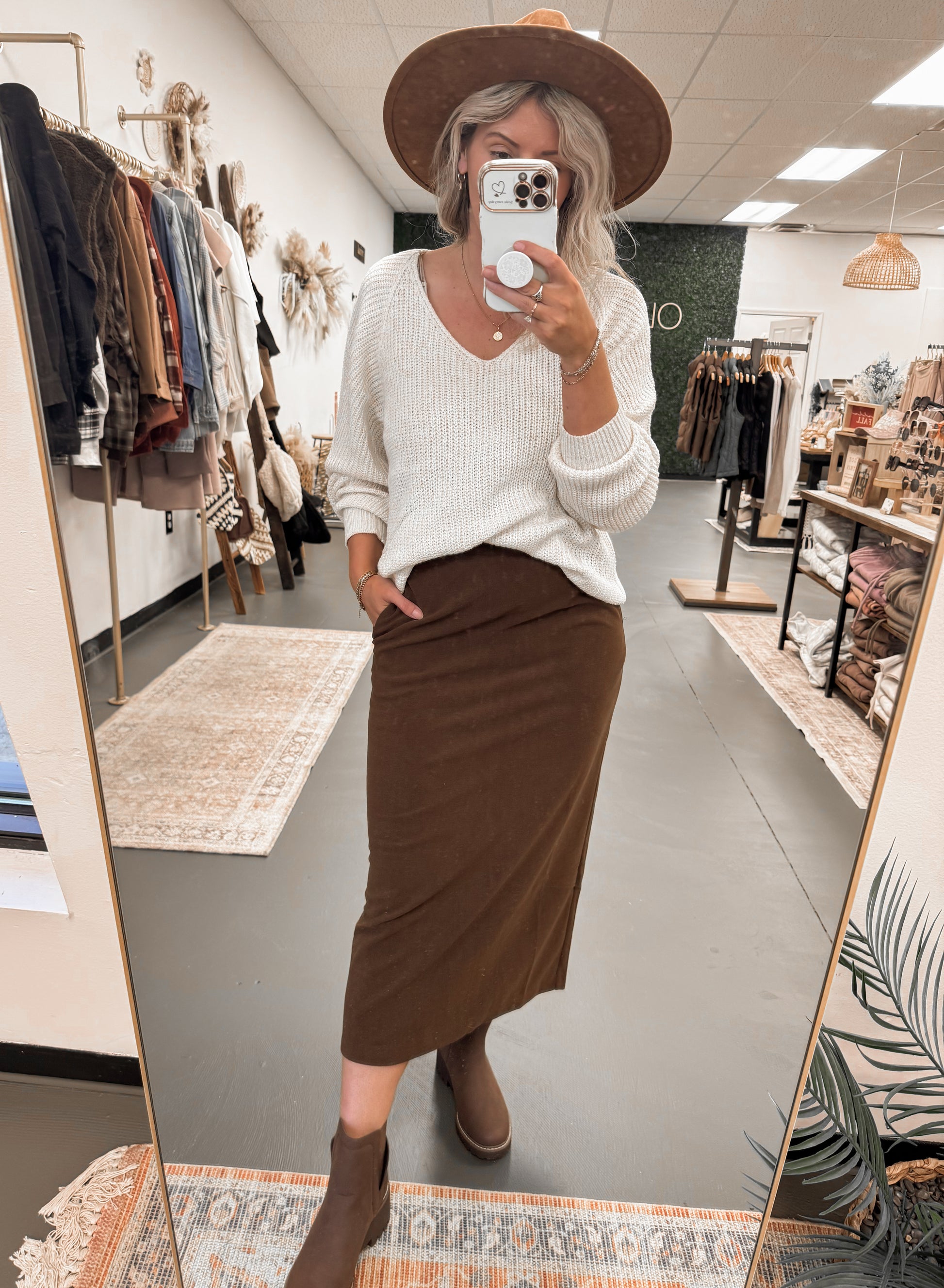 Available in two neutral hues—classic cream and warm brown—this sweater was made to slip seamlessly into your rotation. Whether you’re headed out for errands or curling up at home, it’s the kind of piece that makes getting dressed feel… easy.